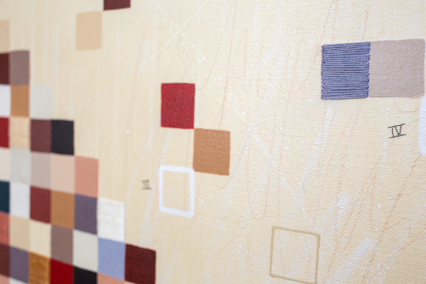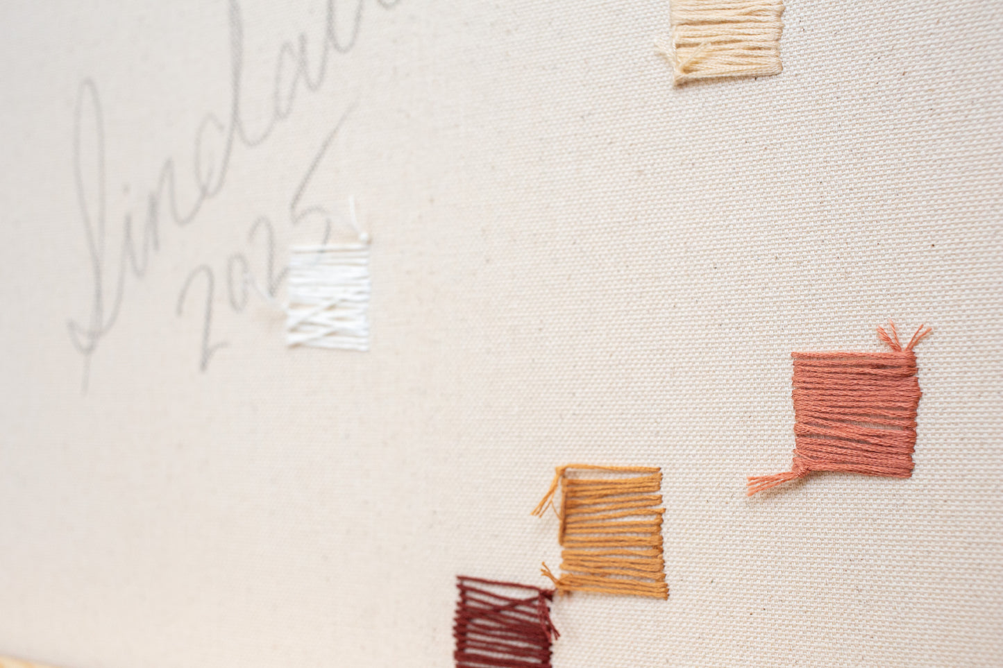Working across oil, acrylic, graphite, and thread, Margot weaves a language of texture that transcends the visual — her pieces are meant to be felt as much as they are seen. Each mark, stitch, and stroke is deliberate, creating layered compositions that, while often grounded in a neutral palette, hold immense depth and movement.