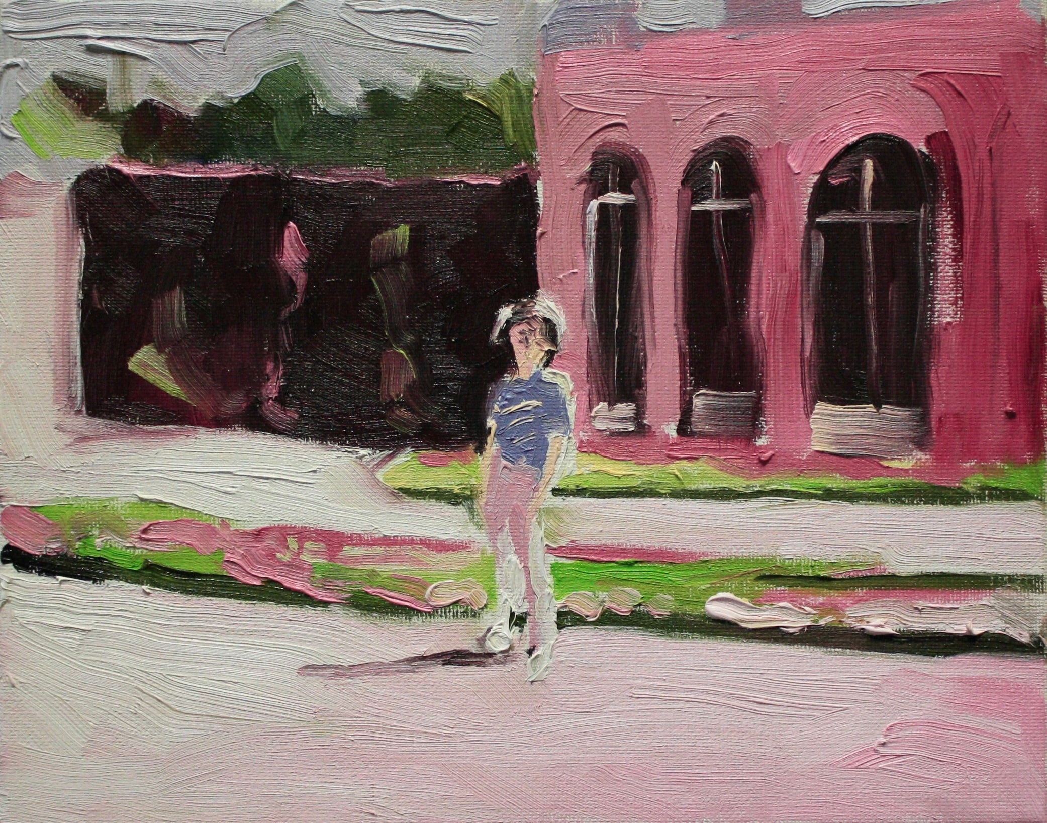 Hayley is drawn to ephemera. She references old family photographs and snapshots from pop culture as sources of inspiration; her renderings capture the essence of a fleeting moment — a vacation you can conjure bits and pieces of, a scene from a beloved childhood movie, a place you can’t quite put your finger on but could swear you visited in a dream. Hayley’s combination of expressionist brushwork and her striking use of colour result in a haunting naïveté that can be traced across her constellation of little worlds.