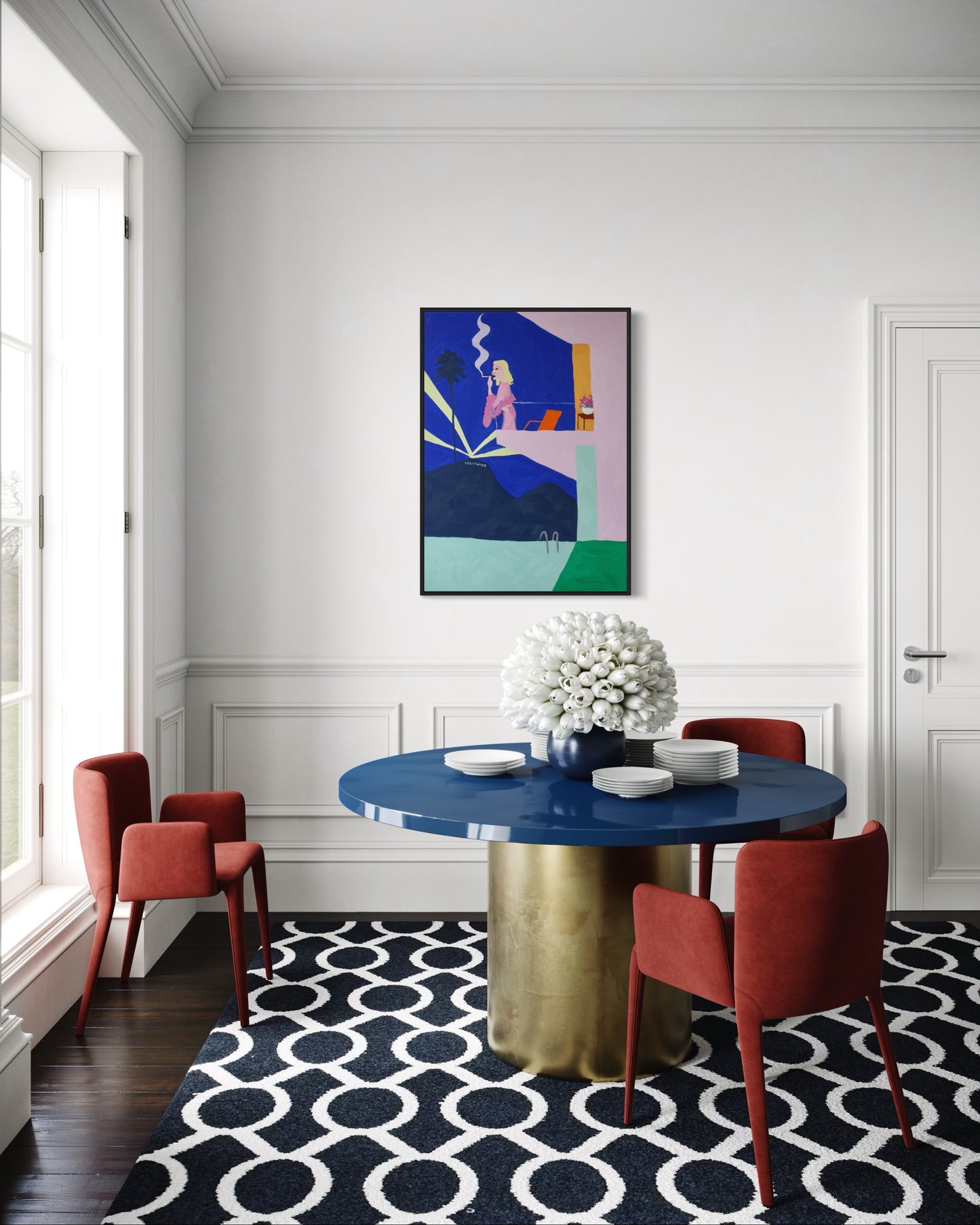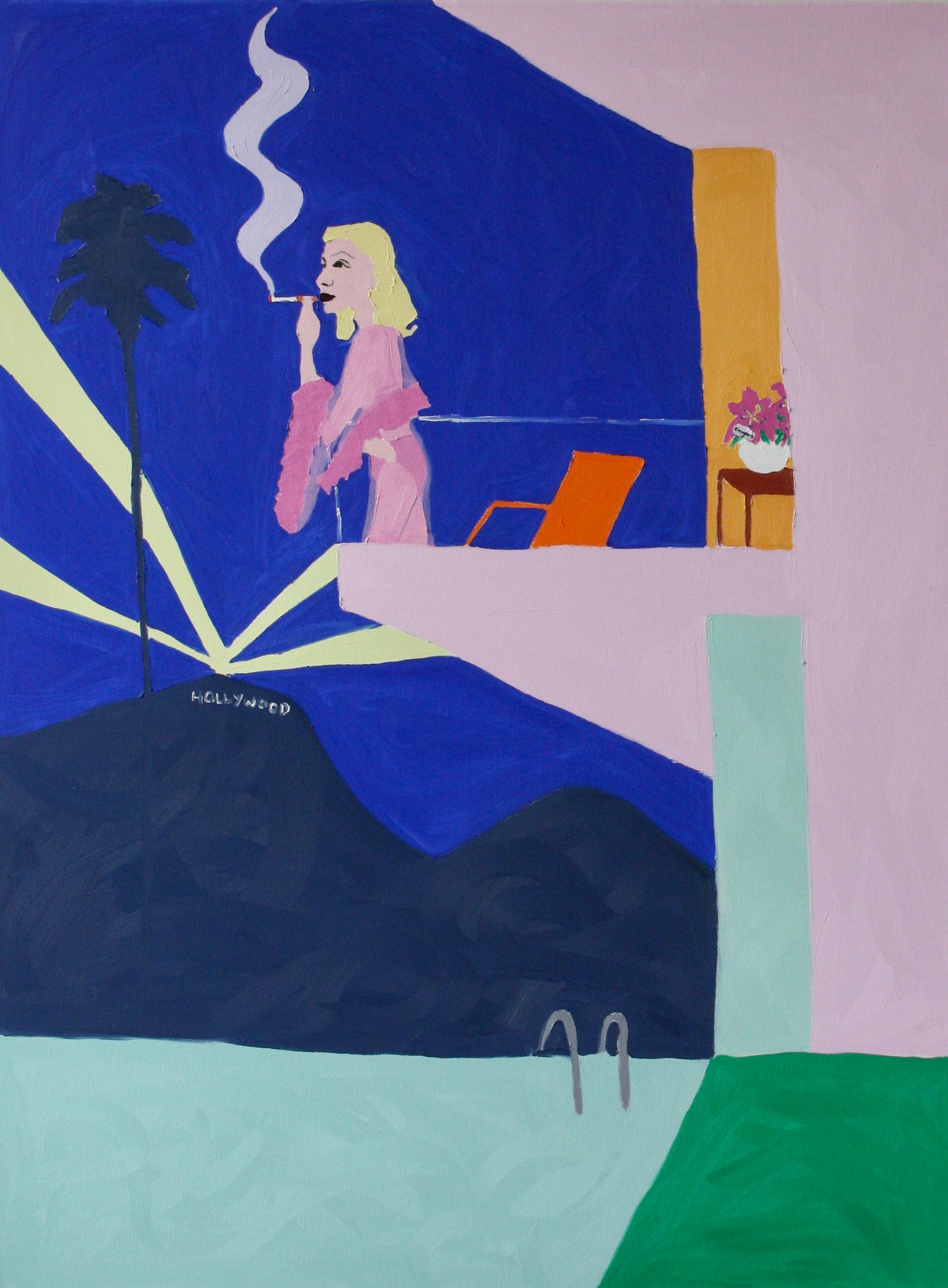 Her paintings are a playful yet poignant exploration of the tension between outward perfection and inner discontent. Humor is a defining characteristic of her work, which remains decidedly unpretentious and light-hearted. Axelrad’s characters, frequently holding a drink in one hand and a cigarette in the other, inhabit spaces where excess and vulnerability collide. Her thick, textured oil paintings are distinguished by bold colors and a matte, almost chalk-like finish.