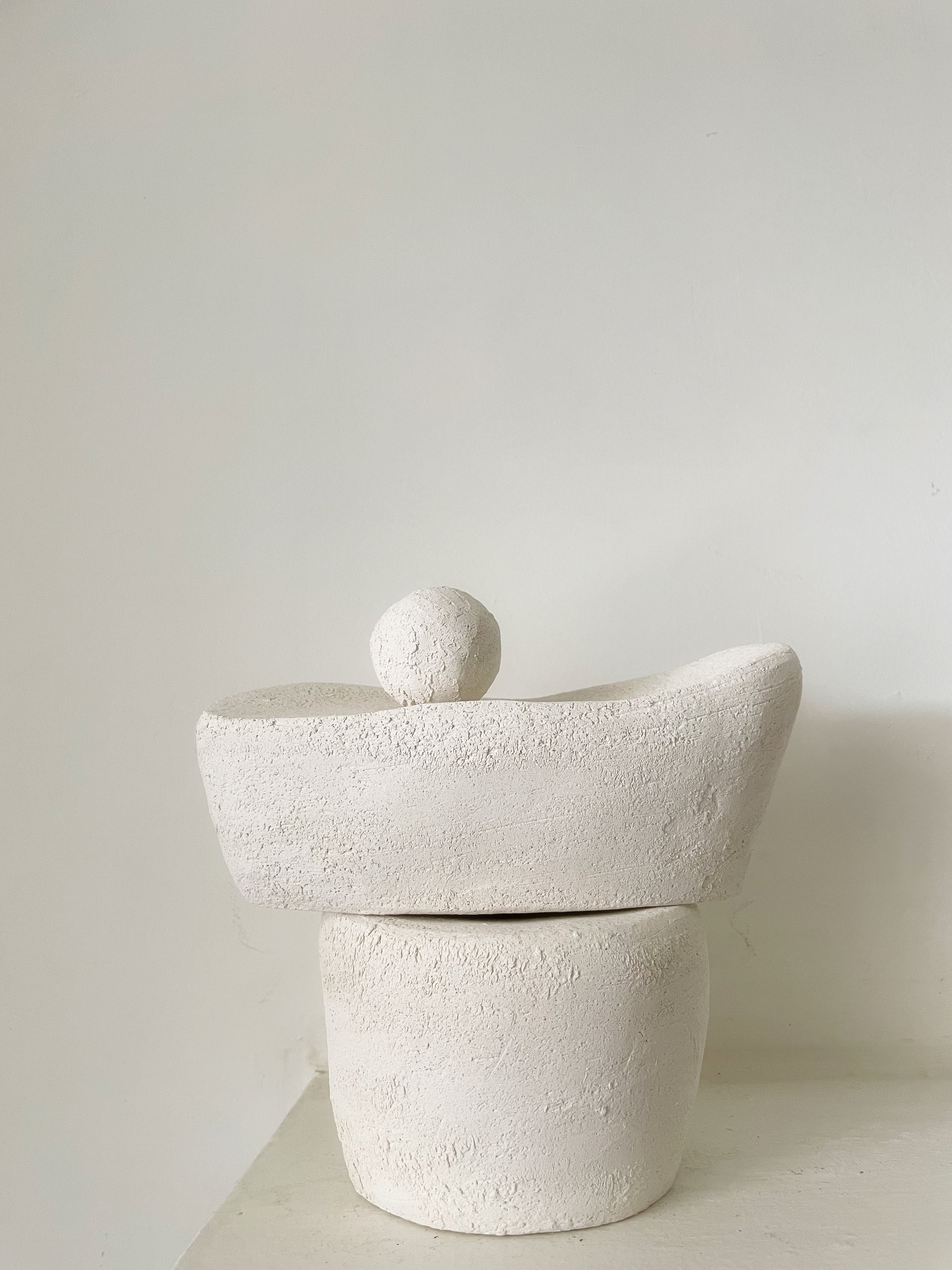 From her tiny studio, she handbuilds sculptural vessels with coiling, slab and