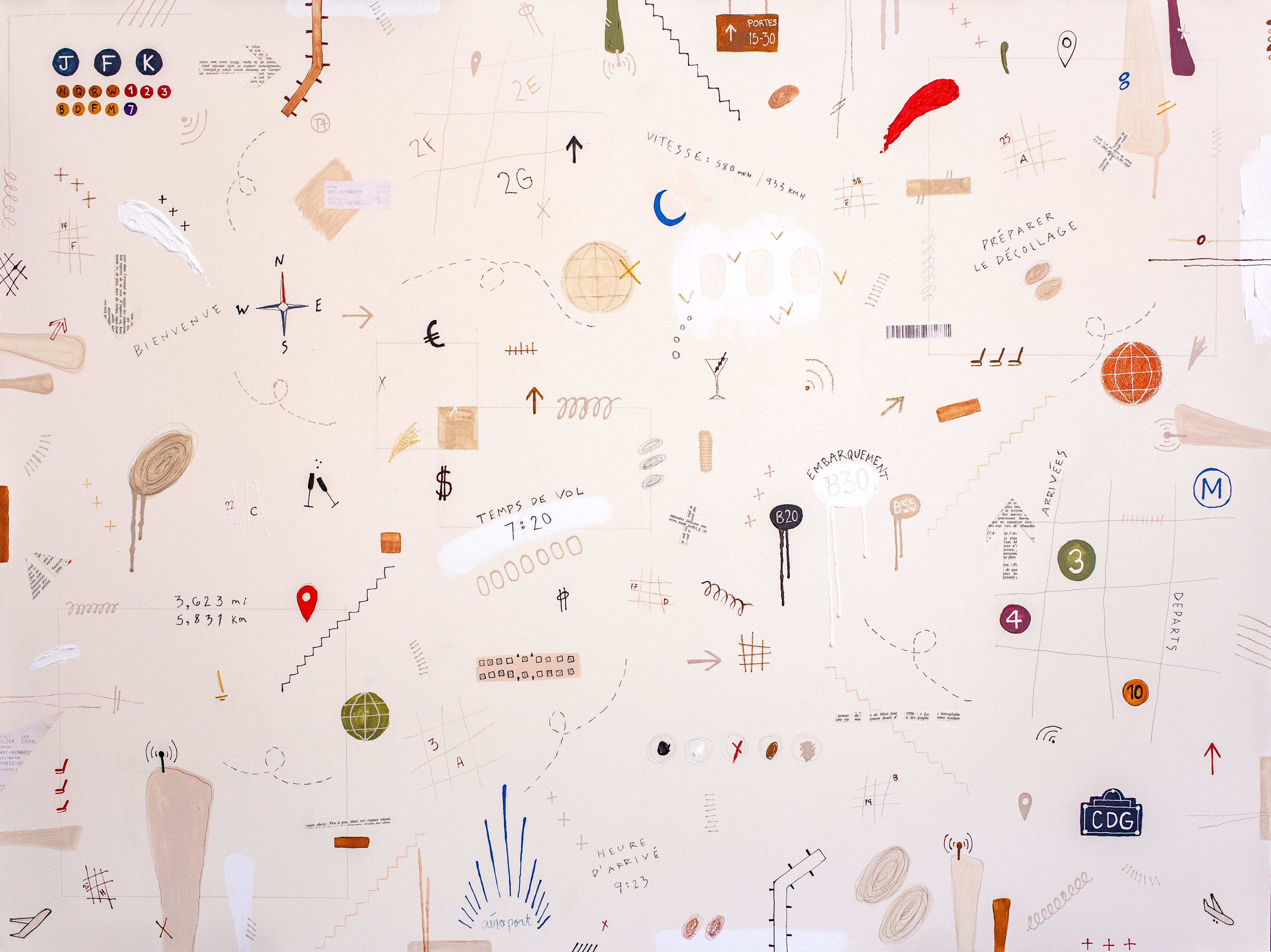 Oil, acrylic, graphite, and thread on stretched canvas.