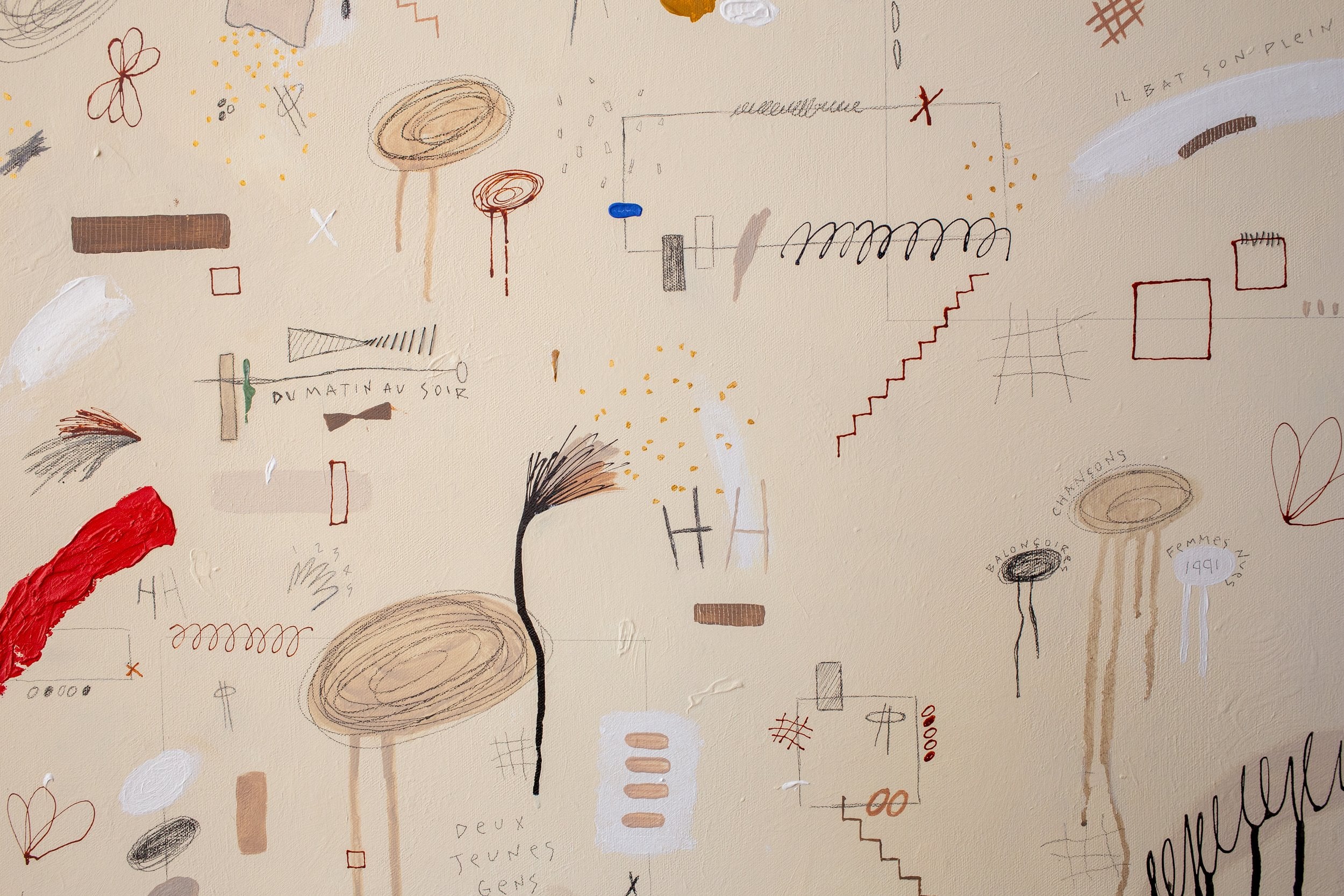 La Fête Continue, in English meaning The Celebration Continues, is the first painting in the Blueprint series — a collection of abstract maps, each titled with the name of an Edith Piaf song. La Fête Continue portrays celebration in various forms, as well as states of progression. Every stroke, mark and thread has intention and meaning, but unlike typical maps, interpretation is up to the viewer. Signed on verso.