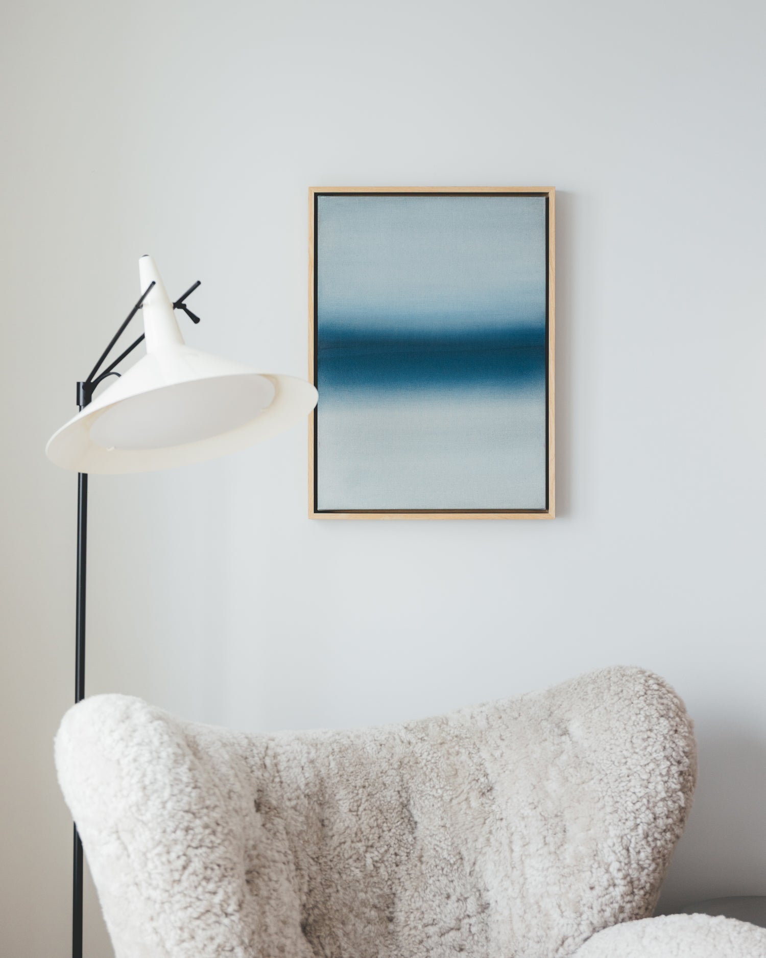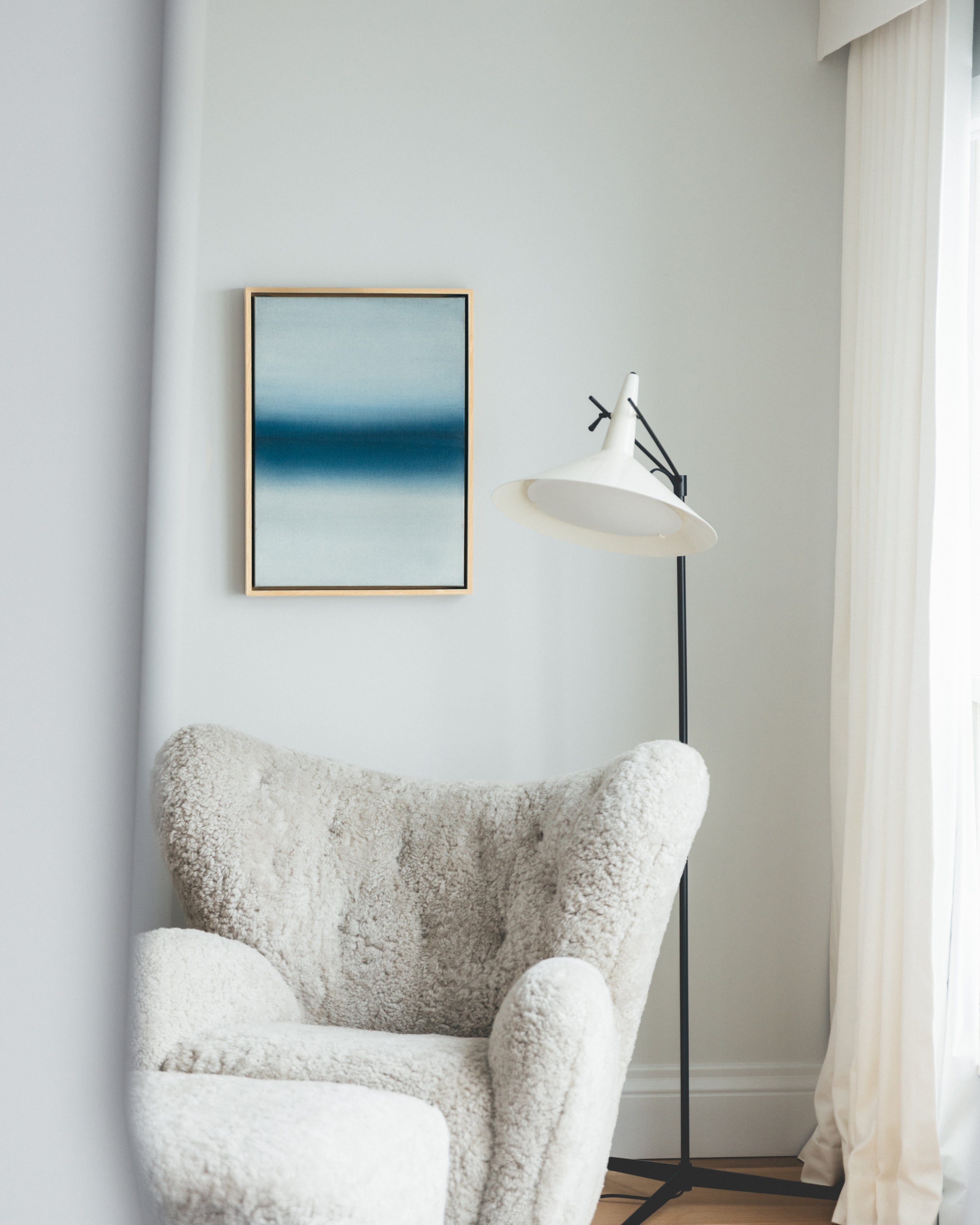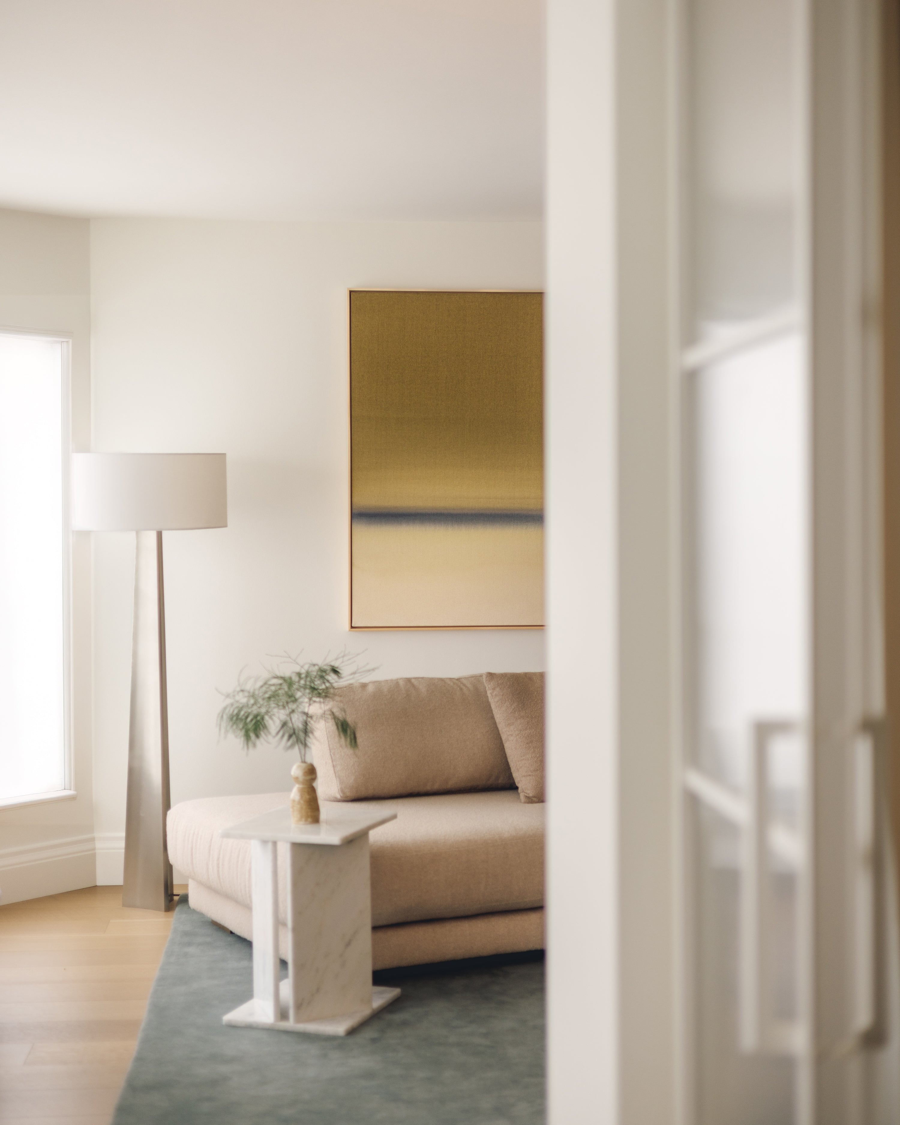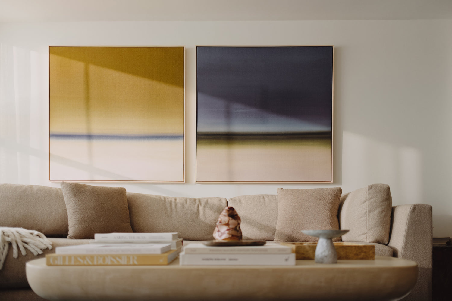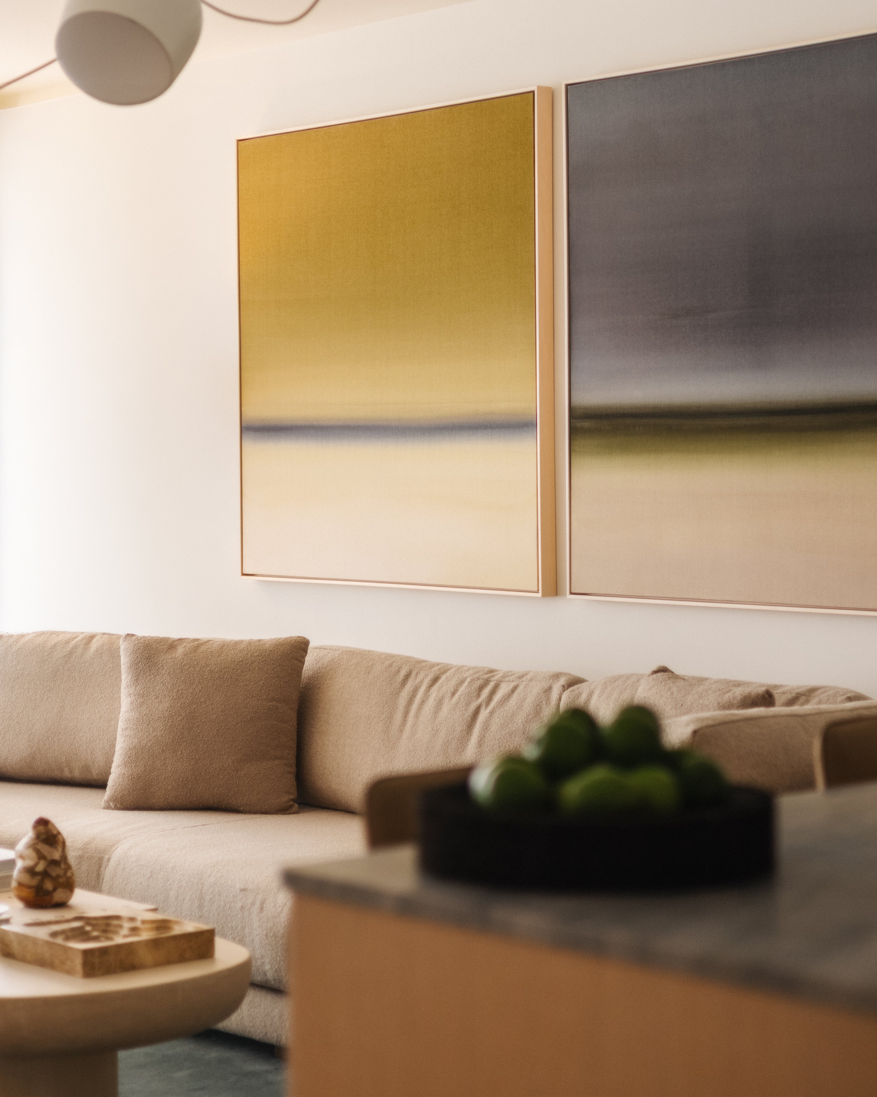 A large-scale diptych anchors the primary living space, introducing a bold focal point that mirrors the scale and horizontality of the surrounding views.