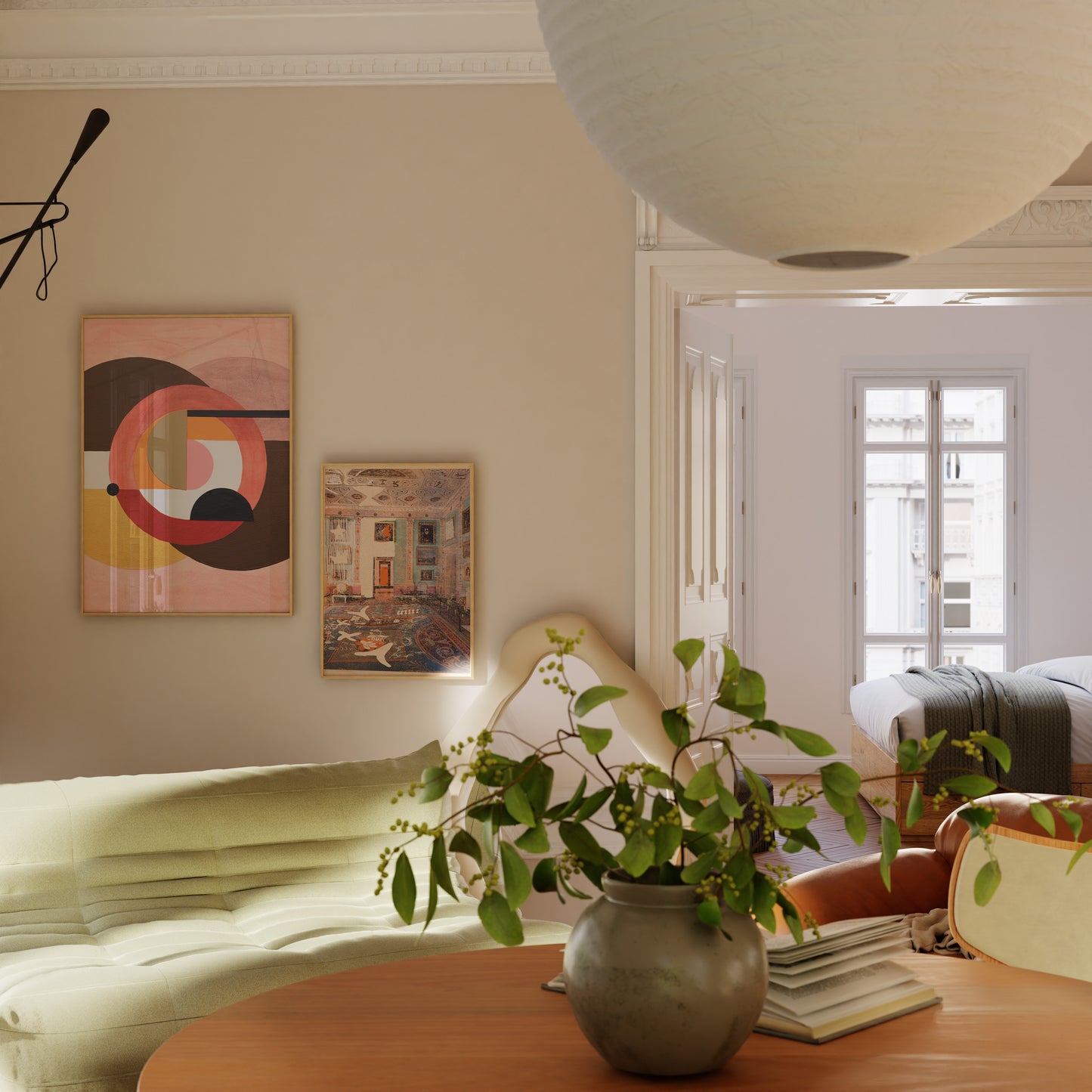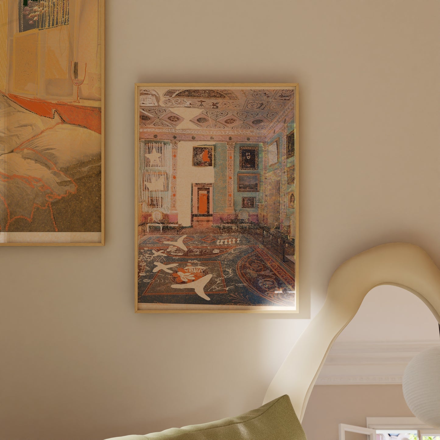 Interior design artwork with warm colour palette in a white frame