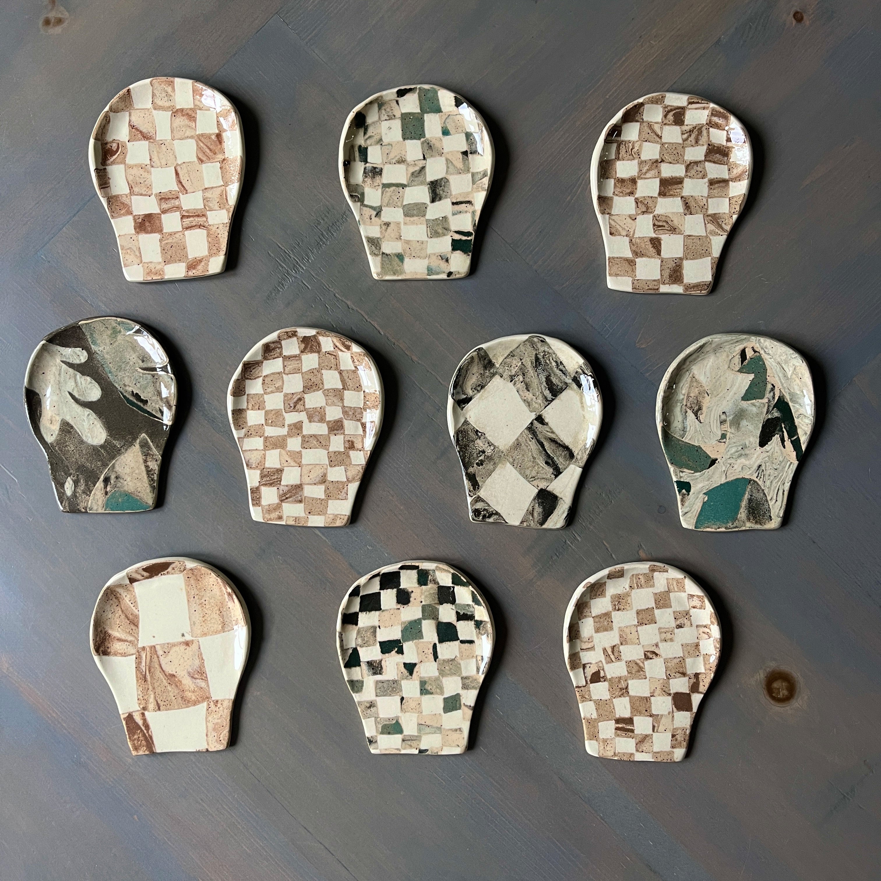 This latest collection of ceramic spoon rests are complete with hand binded teal, terracotta, and brown accents directly into the clay for a unique form-meets-function home accessory.