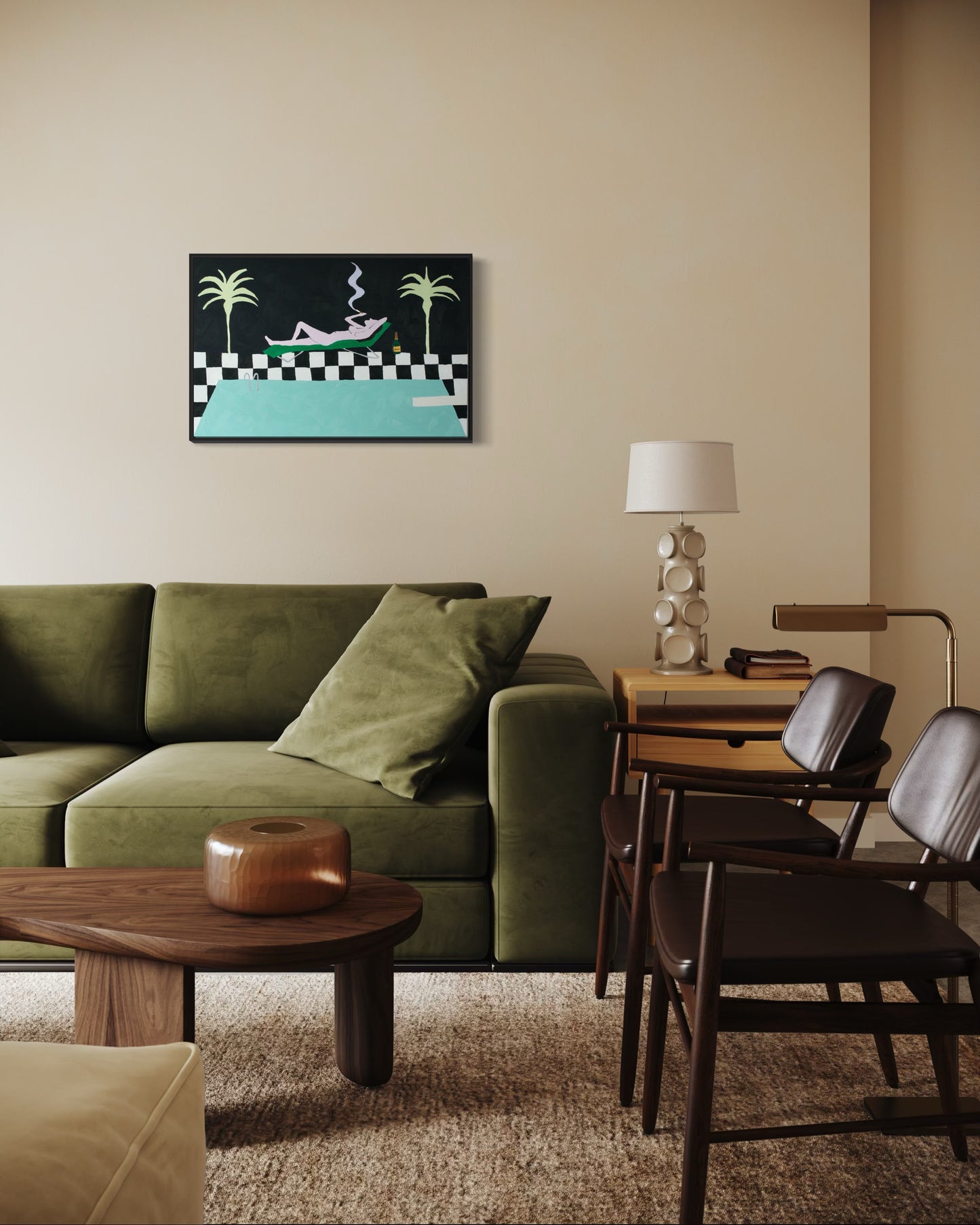 Her paintings are a playful yet poignant exploration of the tension between outward perfection and inner discontent. Humor is a defining characteristic of her work, which remains decidedly unpretentious and light-hearted. Axelrad’s characters, frequently holding a drink in one hand and a cigarette in the other, inhabit spaces where excess and vulnerability collide. Her thick, textured oil paintings are distinguished by bold colors and a matte, almost chalk-like finish.